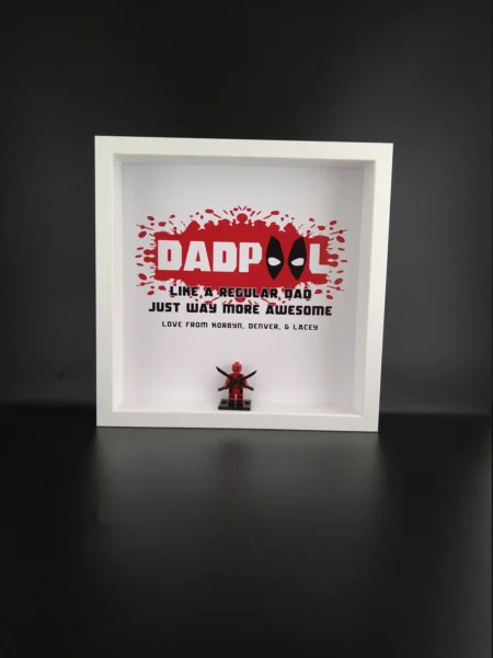 Our one of a kind Dadpool framed print comes complete with a Deadpool mini Figure, and short personalised message.