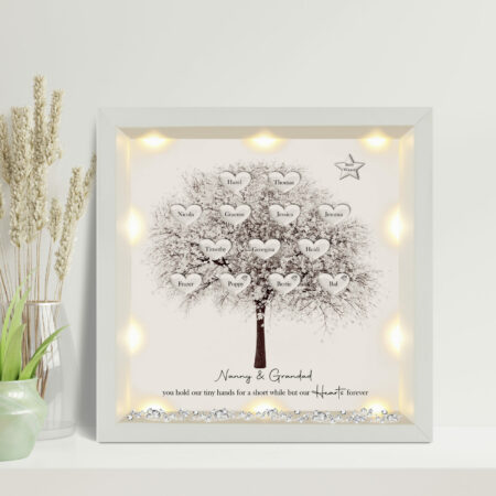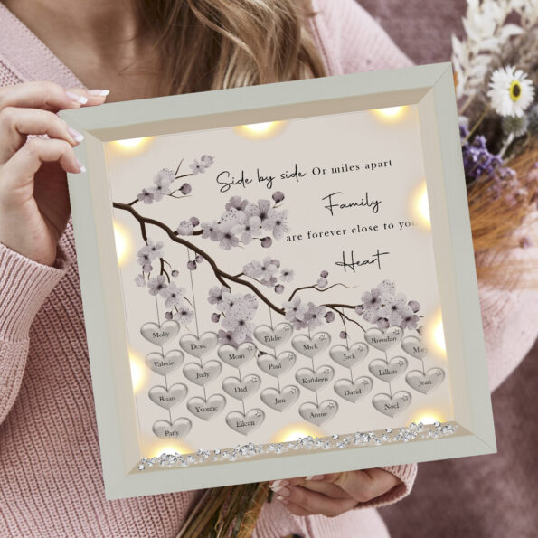 This beautiful piece of artwork is printed on luxury canvas textured photo paper for that extra special touch, personalised with your individual names in hearts and the wording “Side by side or miles apart family are forever close to your heart”.